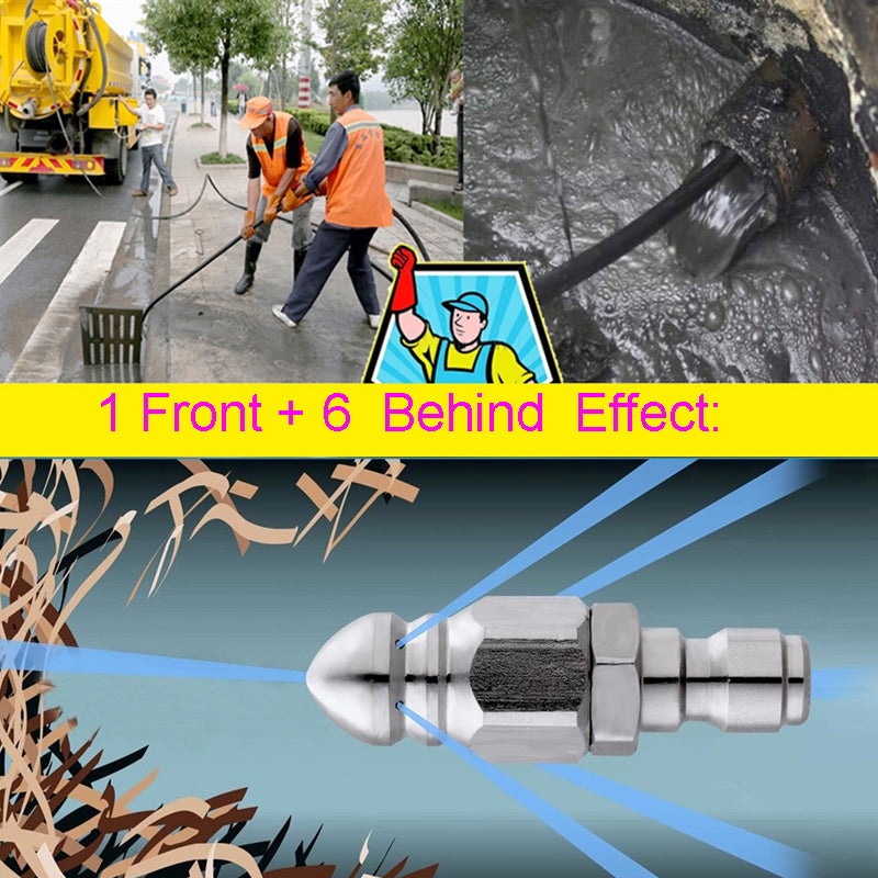 🛠️Ακροφύσιο υψηλής πίεσης από ανοξείδωτο ατσάλι με μπροστινό ακροφύσιο γρήγορης σύνδεσης 1/4 και έξι πίσω ακροφύσια για καθαρισμό και απόφραξη αποχετεύσεων